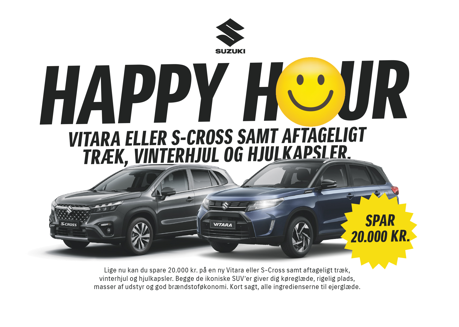 Lige nu kan du spare 20.000 på en ny Vitara eller S-Cross og aftageligt træk, vinterhjul og hjulkapsler. Begge de ikoniske SUV’er giver dig køreglæde, rigelig plads, masser af udstyr og god brændstoføkonomi. Kort sagt, alle ingredienserne til ægte ejerglæde.